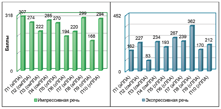 Также важно отметить, что произносительная и слоговая сложность глаголов влияла на их актуализацию у обследуемых с аППА. Пациенты с данной формой легче актуализировали глаголы, простые по слоговой структуре (пьет, идет) по сравнению с глаголами сложной слоговой структуры (расчесывается, завязывает, раскрашивает и др.), что объясняется наличием у них артикуляционных трудностей, в частности орально-артикуляционной апраксии.