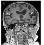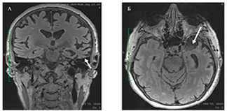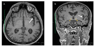 Атрофические изменения в височной и теменной долях доминантного полушария |