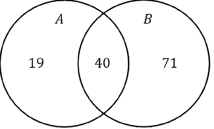 По указанной программе повышения квалификации прошли обучение пять групп. Очные пары проходили у 59 чел., а у 71 чел. занятия проводились заочно с применением дистанционных технологий, при этом итоговая аттестация прошла очно только у 19 чел., а через платформу Moodle, на основе которой сделана электронно-образовательная среда ЮЗГУ, выполнили тестирование 111 чел. Эти данные представлены в виде диаграммы Эйлера – Венна на рис. 1. Здесь А и В – соответственно множества обучающихся очно и заочно, А ∩ В – множество обучающихся по очно-заочной форме.