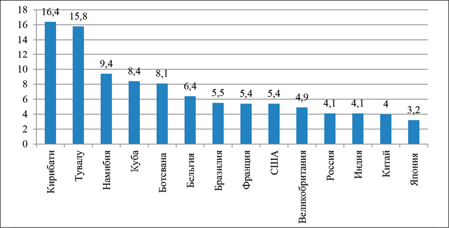 В настоящий момент большинство государств мира понимают высокую значимость развития системы образования. В ряде государств доля государственных расходов в процентах к ВВП достигла достаточно высокого уровня. При этом ряд развивающихся государств (например, Кирибати и Тувалу) имеют показатели, в несколько раз превышающие показатели развитых или динамично развивающихся стран (Кирибати (16,43 %), Тувалу (15,8 %)), а развитые страны Европы не превышают 5–6 % (рис. 1).