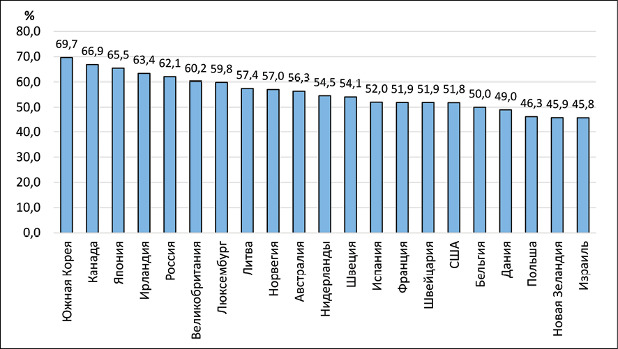 Данный показатель среди молодежи в разных странах варьируется. Южная Корея стабильно занимает одну из первых позиций в данном рейтинге. В этой стране существует культ образования и социальное давление: получение диплома престижного вуза считается обязательным условием для успешной карьеры и высокого социального статуса. В России около 62 % людей молодого возраста имеют высшее образование (ВО) [13]. Это высокий показатель, который ставит Россию выше среднего в один ряд со многими развитыми странами.