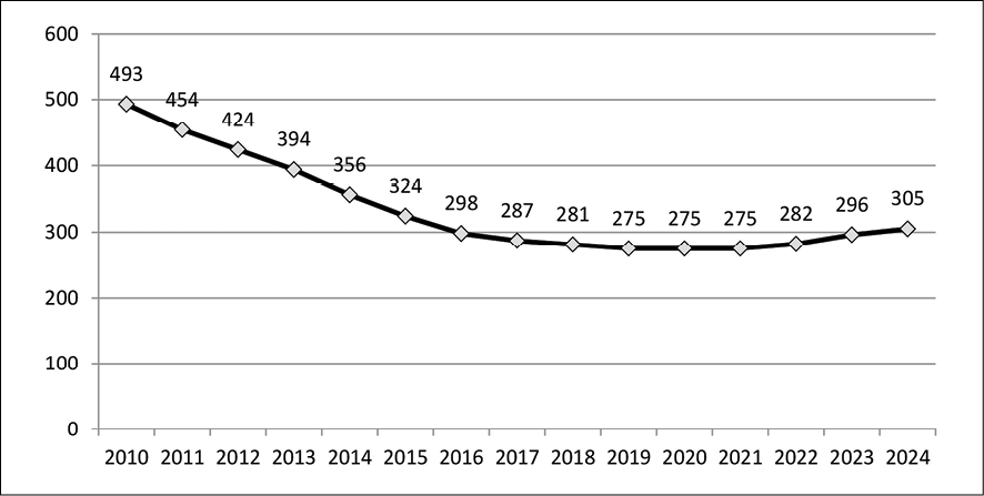 Рис. 3. Изменение числа студентов, обучающихся по образовательным программам высшего образования в России, на начало года за период с 2010 по 2024 г. на 10 тыс. чел. населения [14]