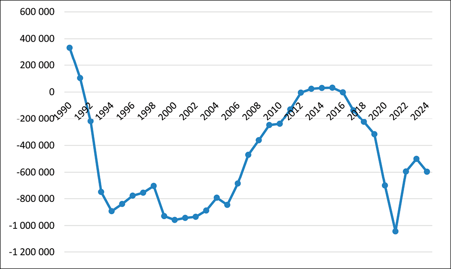 Рис. 4. Естественный прирост населения в России с 1990 по 2024 г., чел. [15]