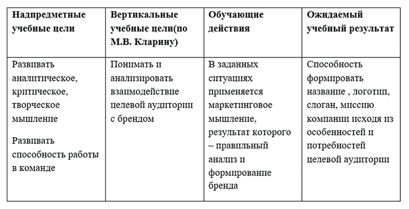 В качестве шаблонов для формирования миссий компаний в учебных целях автор предлагает использовать «конструкты» миссий крупных компаний. Например: «Мы даём людям уверенность и надёжность, делаем их жизнь лучше, помогая реализовывать устремления и мечты» (Сбербанк) [1]. Для мебельной компании по данному шаблону миссия может звучать следующим образом: «Мы даем людям комфорт и тепло, делаем их жизнь уютнее, помогая претворить мечты в жизнь». Также можно использовать миссию зарубежных компаний. Например: «Обмениваем знания через документы». Для компании по продажи духов в данном шаблоне миссия может быть сформулирована следующим образом: «Передаем эмоции/страсть через ароматы». Данные шаблоны направлены на формирование когнитивного компонента маркетинговой компетенции.