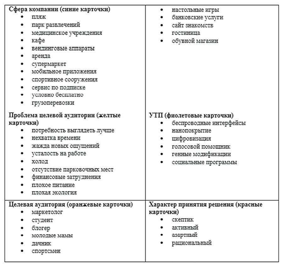 Выбор данной игры обусловлен необходимостью неординарных решений, формулирующихся на основе карточек, в рамках которых сложнее использовать искусственный интеллект. Так, сфера работы компании – кафе, рестораны, продажа ноутбуков и пр. (на одной карточке) в сочетании с технологией, которая обеспечивает УТП компании (гибкие экраны, чат-боты, технология оплаты и др.), в сочетании с материалом на другой карточке (проблема целевой аудитории – нехватка времени, быстрая утомляемость и др.) делает трудоемким процесс формулирования запроса, но главное, что на данный момент ответ ИИ получается шаблонным. Комментарий: может быть и шаблонным, что не факт, но НЕ трудоемким, few-shot prompting, или системный промпт, с указанием ролей решит эту задачу, и современный студент (поколение Z) в массе владеет названными методами. А значит ставит перед студентом запрос на самостоятельное выполнение задачи. Содержание карточек приведено на рис. 2.
