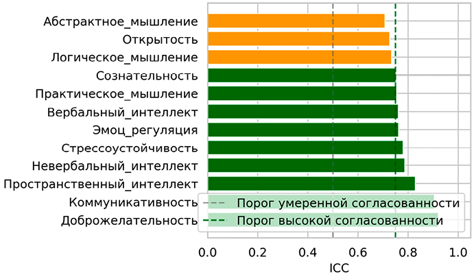 Согласованность экспертов (рис. 3) оценивалась с помощью внутриклассового коэффициента корреляции ICC(2,1) – двухсторонняя случайная модель с абсолютным согласием. По результатам анализа видно, что высокая согласованность (ICC > 0,75) достигнута по большинству параметров. По трем параметрам (абстрактное мышление, открытость и логическое мышление) практически достигнут порог высокой согласованности. Данные результаты говорят о высокой надежности данных.