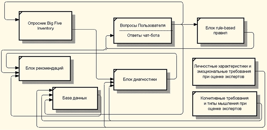 Концептуальная модель чат-бота в составе системы поддержки принятия решений по выбору профиля обучения представляет собой комплексный цифровой инструмент, объединяющий диагностические, информационные и рекомендательные компоненты [15; 16]. В рамках работы чат-бот выступает пользовательским интерфейсом системы поддержки принятия решений (СППР), обеспечивающим естественный, доступный и мотивирующий формат взаимодействия с обучающимся.