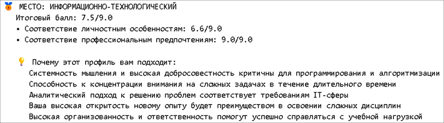Полученные результаты демонстрируют, что разработанная система способна на основе объективной оценки личностных характеристик формировать обоснованные, этичные и практичные рекомендации по выбору профиля обучения.