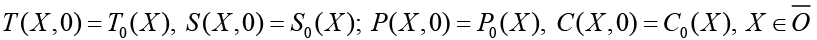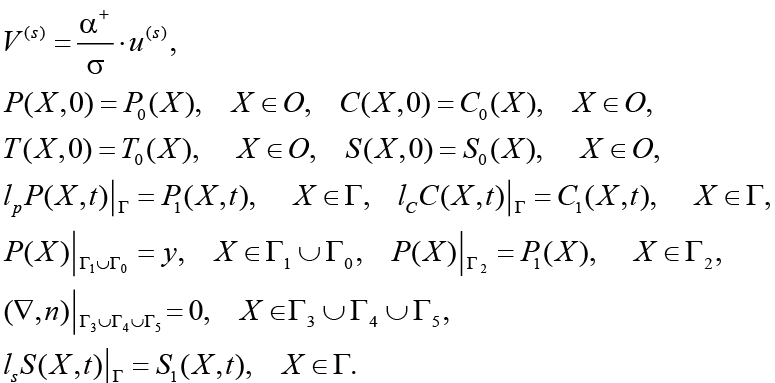 где t ∈ [0; t0], lp, lc, lT, ls – операторы граничных условий для давления, концентрации соли, температуры и концентрации пульпы, соответственно.