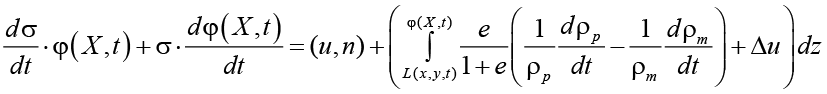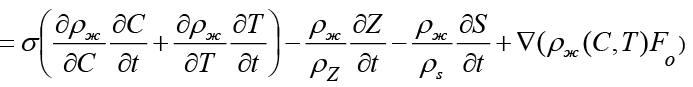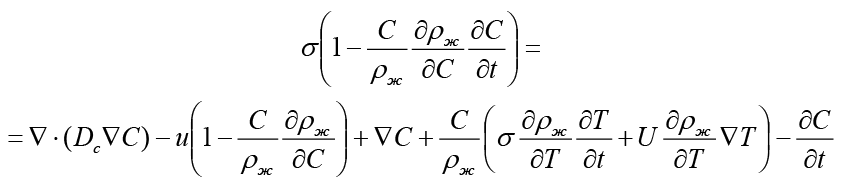 Учтем в уравнении переноса массы частиц воздействие химических и термических факторов, которые влияют на изменение плотности жидкости в порах грунта [13]: