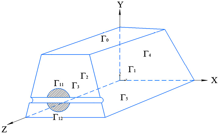 На основании расчетной модели, показанной на рис. 1, будем считать весь объем дамбы (плотины) некоторой трехмерной областью О1, на которую наложен ряд ограничений – Г1, Г2, Г3, Г4, Г5. При этом Г0 – это свободная поверхность (граница), представляющая собой поверхность гребня дамбы (плотины). В объеме О1 находится водовод и область размыва, которую обозначим как О2. На область размыва О2 наложим ряд взаимосвязанных ограничений: Г2, Г3 – участки границы, через которые водовод «дышит», контактируя с окружающей атмосферой; Г1, Г4, Г5 – границы служат абсолютными барьерами, через которые ничего не проникает; Г12 – граница становится актуальной, когда процесс вымывания грунта происходит с высокой скоростью; Г11 – граница играет ключевую роль в определении взаимосвязи между различными параметрами, так как она разделяет пористый грунт и область, где происходит его вымывание пульпой. Пульпой будем считать водный раствор соли (если речь идёт о переносе соли) и твёрдых, нерастворимых частиц, вымытых из грунтового массива. Стенки водовода – непроницаемые.