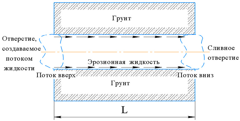 Область размыва начинает образовываться во время контактной эрозии грунта с водоводом, последний заполняется пульпой, согласно рис. 3. Для математического описания характера изменения концентрации пульпы в области размыва с учетом скорости осаждения частиц пульпы в водоводе воспользуемся диффузионной моделью в тензорном виде [14]: