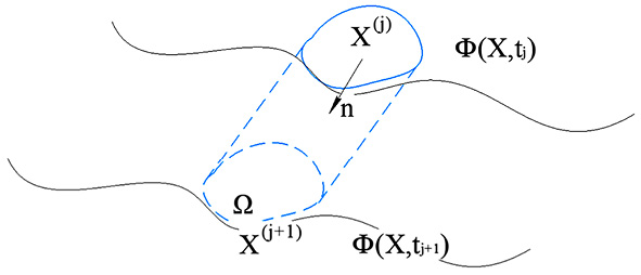 В момент времени t = tj на свободной поверхности Ф(X, t, j), определяемой условием, для отдельной области Ω(j) зафиксировано положение. Далее исследовано движение этой свободной поверхности, направленное вдоль внешней нормали n (рис. 4).