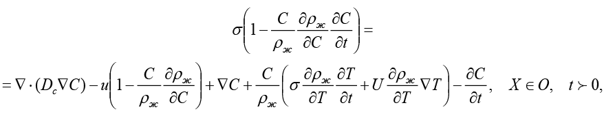 2. Уравнения переноса теплоты и массы движущихся частиц. Вследствие интеграции антропогенных факторов в представленные уравнения фильтрации для полного описания процессов переноса теплоты и массы движущихся частиц в жидкой фазе требуется дополнить систему уравнений. Это дополнение должно включать уравнения, позволяющие определить: концентрацию растворенных солей в жидкой фазе грунта С(X,t), температурное поле грунта, концентрацию солей в твердой фазе грунта, концентрацию взвешенных нерастворимых твердых частиц в жидкой фазе.