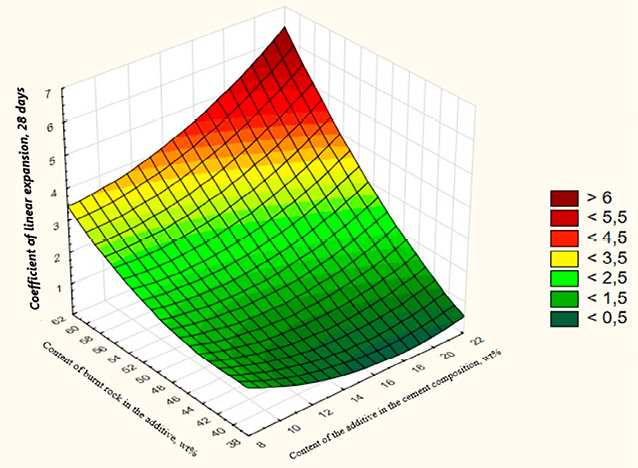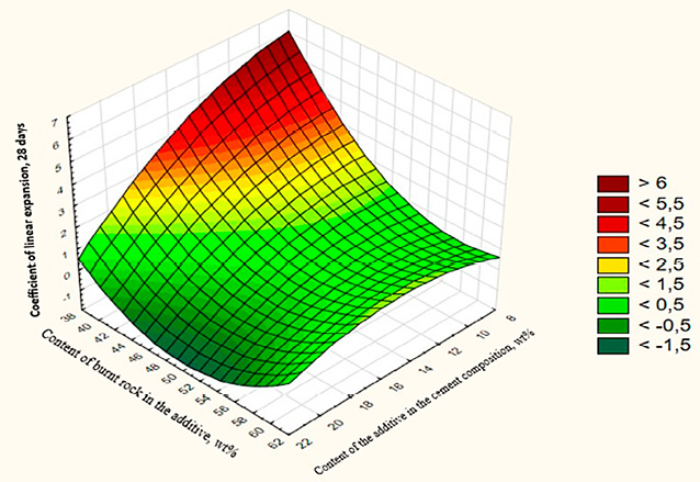 Установление значения линейного расширения опытных образцов, изготовленных на основе второго состава цементной композиции, через 28 суток производится на основе поверхности отклика, изображенной на рис. 2б.