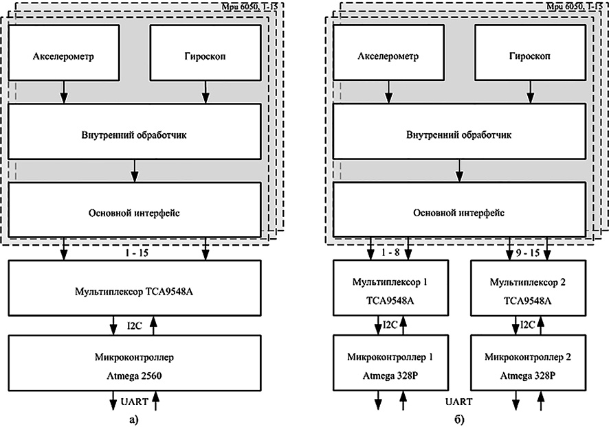 Исходная система регистрации движений [2] включала 15 инерциальных датчиков MPU-6050. Каждый датчик имеет два встроенных адреса. Для расширения адресного пространства и сопряжения всех датчиков с микроконтроллером ATmega2560 использовался мультиплексор TCA9548A. Информация, поступающая в микроконтроллер с датчиков, обрабатывалась с помощью фильтра Калмана и затем передавалась на устройство сбора информации (рис. 1а). Основным недостатком данной архитектуры являлась последовательная обработка данных: центральный процессор последовательно опрашивал и обрабатывал показания каждого датчика. При частоте опроса 100 Гц это приводило к перегрузке вычислительных ресурсов и риску потери пакетов данных.
