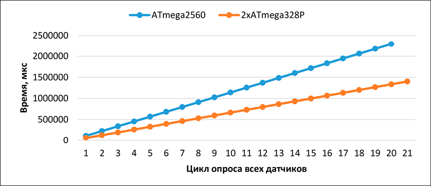 Для верификации эффективности предложенного подхода было проведено сравнение двух конфигураций системы: конфигурация А (один микроконтроллер ATmega2560), последовательный опрос датчиков, монолитная программа. Конфигурация Б (два микроконтроллера ATmega328P), параллельная работа, распределённая обработка.