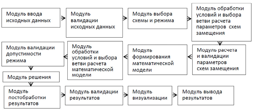 2. Архитектуру вычислительного ядра интерактивных электротехнических моделей целесообразно проектировать на основе модульного подхода, предусматривающего модули валидации на каждом этапе расчета: от ввода данных до вывода результатов. Модульная конструкция ядра позволяет изменять набор модулей, модернизировать отдельные составляющие, повторно использовать разработанный код в аналогичных моделях, а также ускоряет процесс отладки.