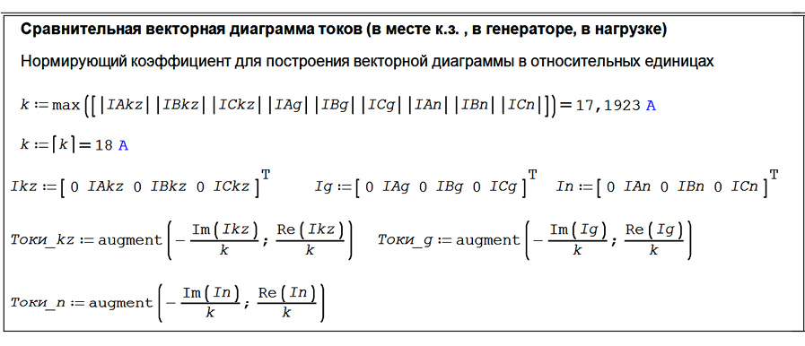 Поскольку SMath Studio не корректирует пределы осей автоматически, динамически изменяющиеся при вариации параметров диаграммы целесообразно строить в относительных единицах. При этом нормирующий масштаб должен пересчитываться для каждого нового режима и отображаться непосредственно на поле графика. Пример расчета нормирующего коэффициента для векторной диаграммы токов приведен на рис. 2.