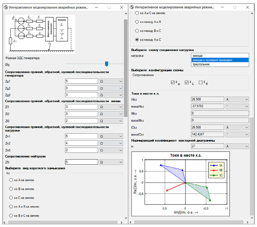 Пользователь может изменять исходные параметры источника и элементов, выбирать вид короткого замыкания (к. з.), схему нагрузки и конфигурацию цепи. При любом изменении в режиме реального времени пересчитываются токи, напряжения, мощности и динамически перестраивается векторная диаграмма. В приведенном фрагменте для компактности отображены только токи в месте короткого замыкания и соответствующая векторная диаграмма. В полной версии модели выводятся 18 значений токов и напряжений, включая их симметричные составляющие (в месте к. з., в генераторе и в нагрузке), потребляемая мощность, а также строятся 6 соответствующих векторных диаграмм.