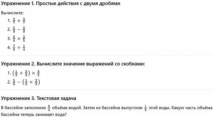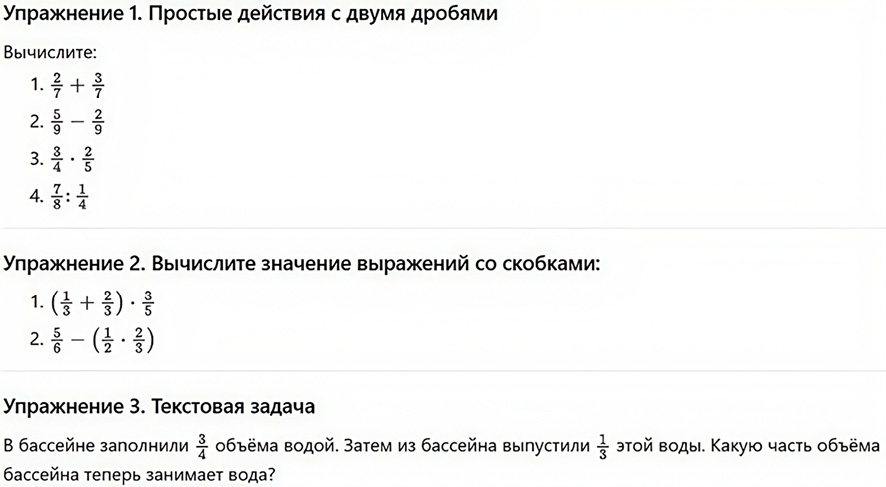 В представленном промпте ключевым запросом была проверка знаний учащихся в контексте действий с дробями, следовательно, ответ нейросети представляет собой упражнения, направленные исключительно на проверку понимания данных математических операций и на данном этапе не требует доработок.